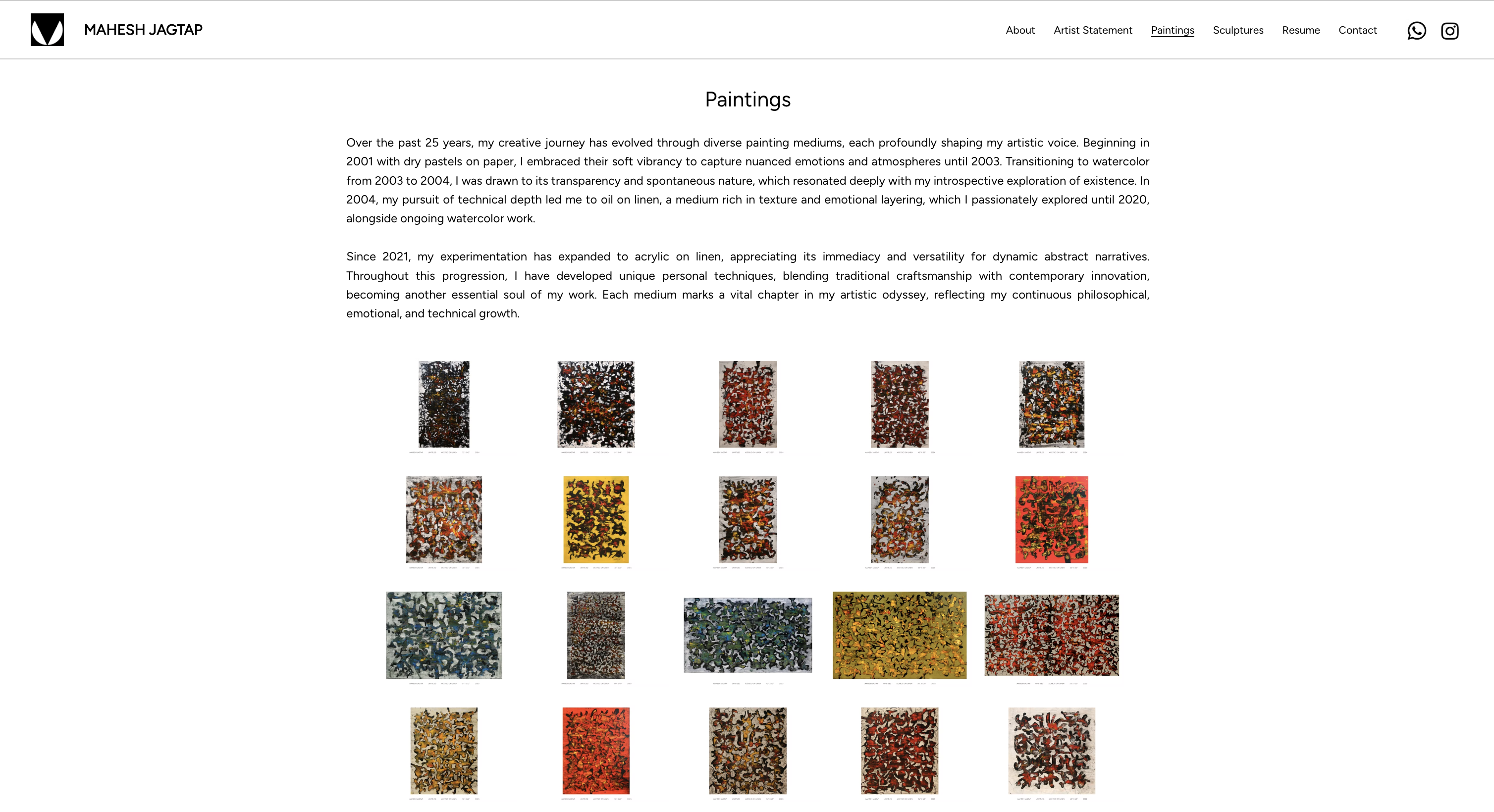 We developed the official website for Mahesh Jagtap, a multidisciplinary artist, painter, sculptor, and conservator with over fifteen years of experience. The website serves as a comprehensive and visually engaging portfolio, highlighting his artistic journey, creative philosophy, and diverse body of work. Visitors can explore his paintings, sculptures, artist statement, and professional résumé through an immersive platform that reflects both his artistic depth and dedication to the preservation of cultural heritage.